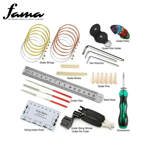 -Includes string action ruler and gage measuring tool and hex wrench set and file and string winder and string cutter and bridge pin and pick and pick bag.