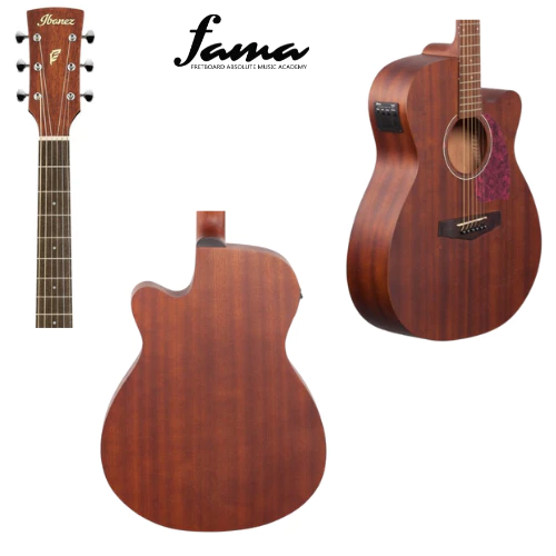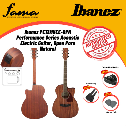 The PC12MHCE features a grand concert body with a Venetian cutaway and a laminated mahogany top on mahogany back and sides with an open pore finish.